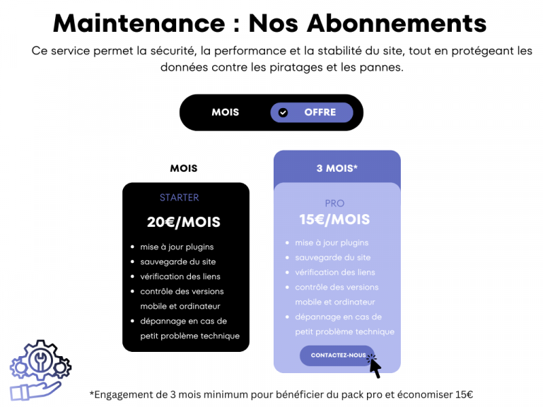 BONUS 2 : Deux mois de maintenance offerts (suivi hebdomadaire), comprenant les mises à jour, la sauvegarde du site, le dépannage en cas de petits problèmes techniques !